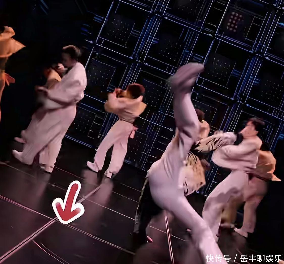 舞台地板上那两条深深的印记,就是鞋上镶的钻和地板摩擦产生的。可见当时力道不小,相比王一博的认真回应,沈腾这边的回应就很有意思。